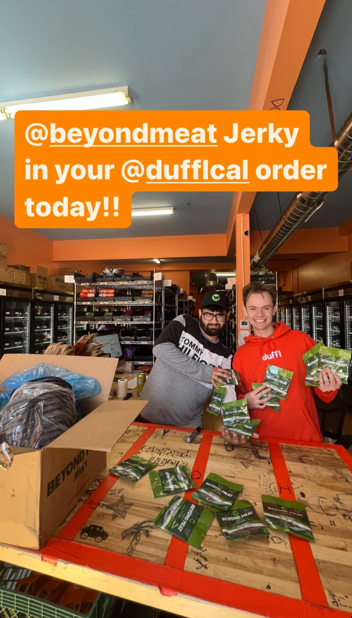 My team successfully secured a limited-time partnership with Duffl, a rapid delivery service for convenience-store-type goods, to distribute 300 Beyond Jerky packets during a designated time slot.